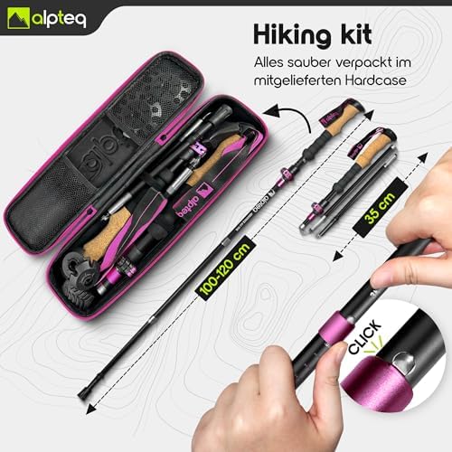Dank ihrer einstellbaren Länge von 115-135 cm können Sie die Trekkingstöcke ganz leicht an Ihre individuellen Bedürfnisse anpassen. Im gefalteten Zustand messen sie nur 35 cm und lassen sich mühelos in Rucksäcken oder Gepäck verstauen. Diese Funktionalität macht die Alpteq Wanderstöcke zu einem unverzichtbaren Begleiter für Outdoor-Enthusiasten, die Flexibilität und Langlebigkeit schätzen.