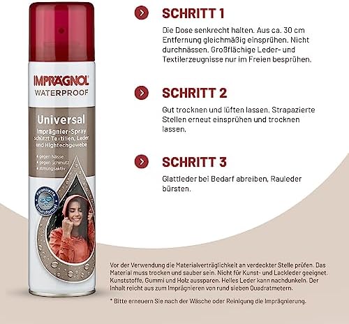 Dieses Produkt eignet sich perfekt für verschiedene Anwendungsbereiche. Schutz für Kleidung, Schuhe, Taschen und Rucksäcke? Kein Problem! Mit Imprägnol sichern Sie sich und Ihre Lieblingsstücke langfristig ab. Ideal für Outdoor-Aktivitäten sowie den täglichen Gebrauch.