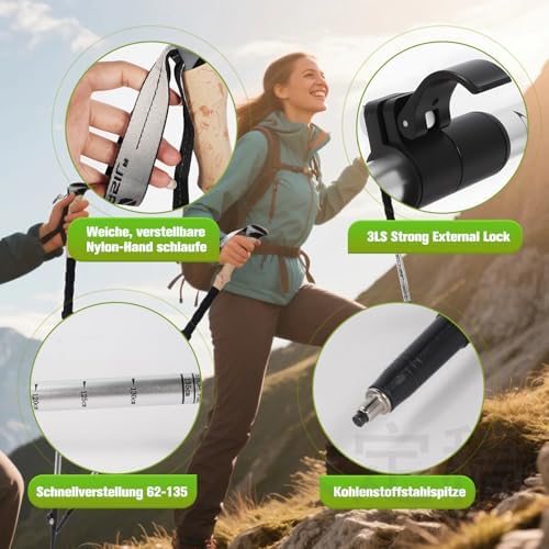 - Schmerzlinderung beim Wandern: Die verstellbaren Handschlaufen entlasten die Handgelenke und ermöglichen stundenlangen Komfort auf Ihren Touren.
