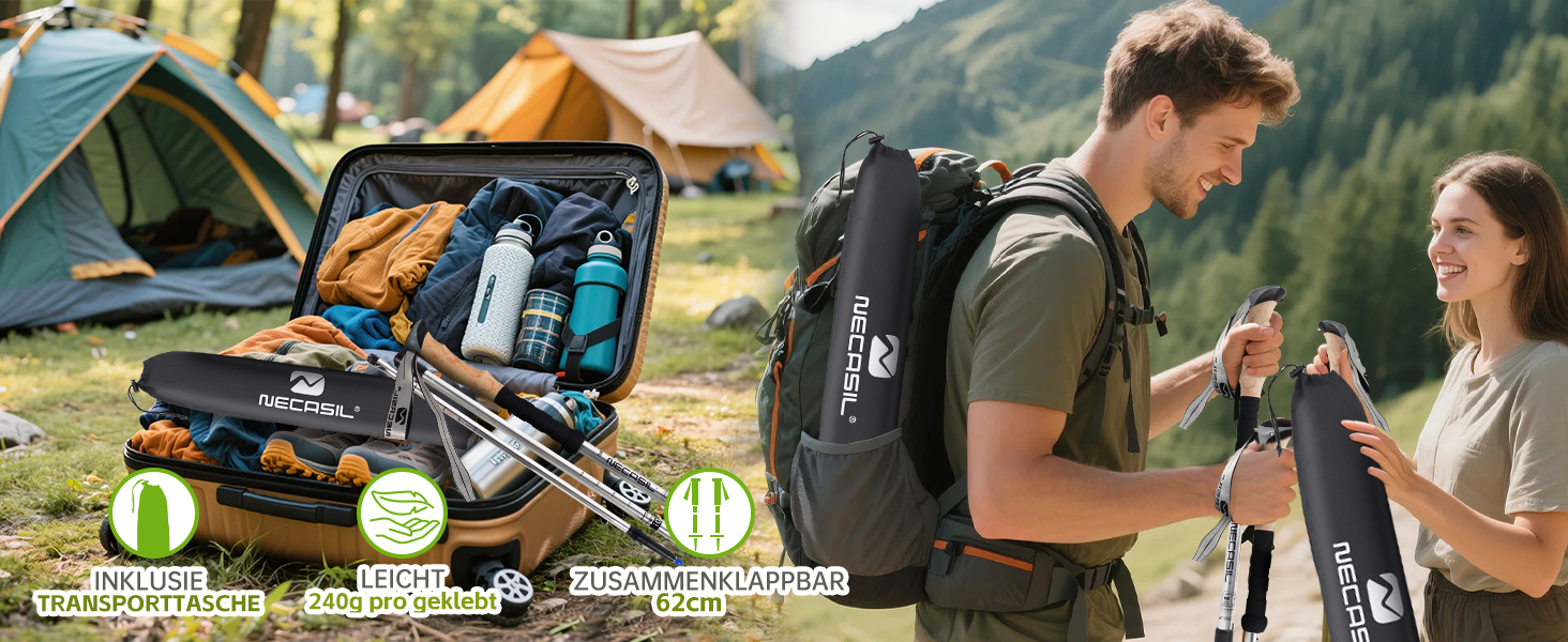 - Flexibilität beim Reisen: Faltbare Wanderstöcke lassen sich platzsparend transportieren und sind leicht zu handhaben, perfekt für Reisende.