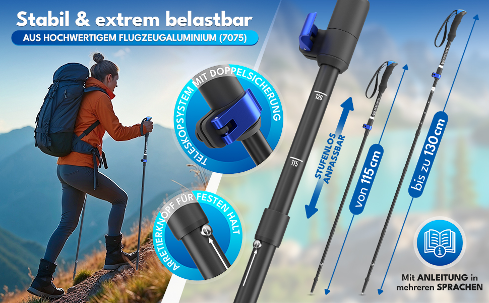Unsere Teleskop-Wanderstöcke sind dank eines ausgeklügelten Teleskopsystems stufenlos von 115 cm bis 130 cm einstellbar. Dieses praktische Feature ermöglicht eine individuelle Anpassung an jede Körpergröße, egal ob für Damen, Herren oder Jugendliche. Zudem sorgt die Doppelsicherung mit Arretierknopf dafür, dass die Stöcke blitzschnell einsatzbereit sind.